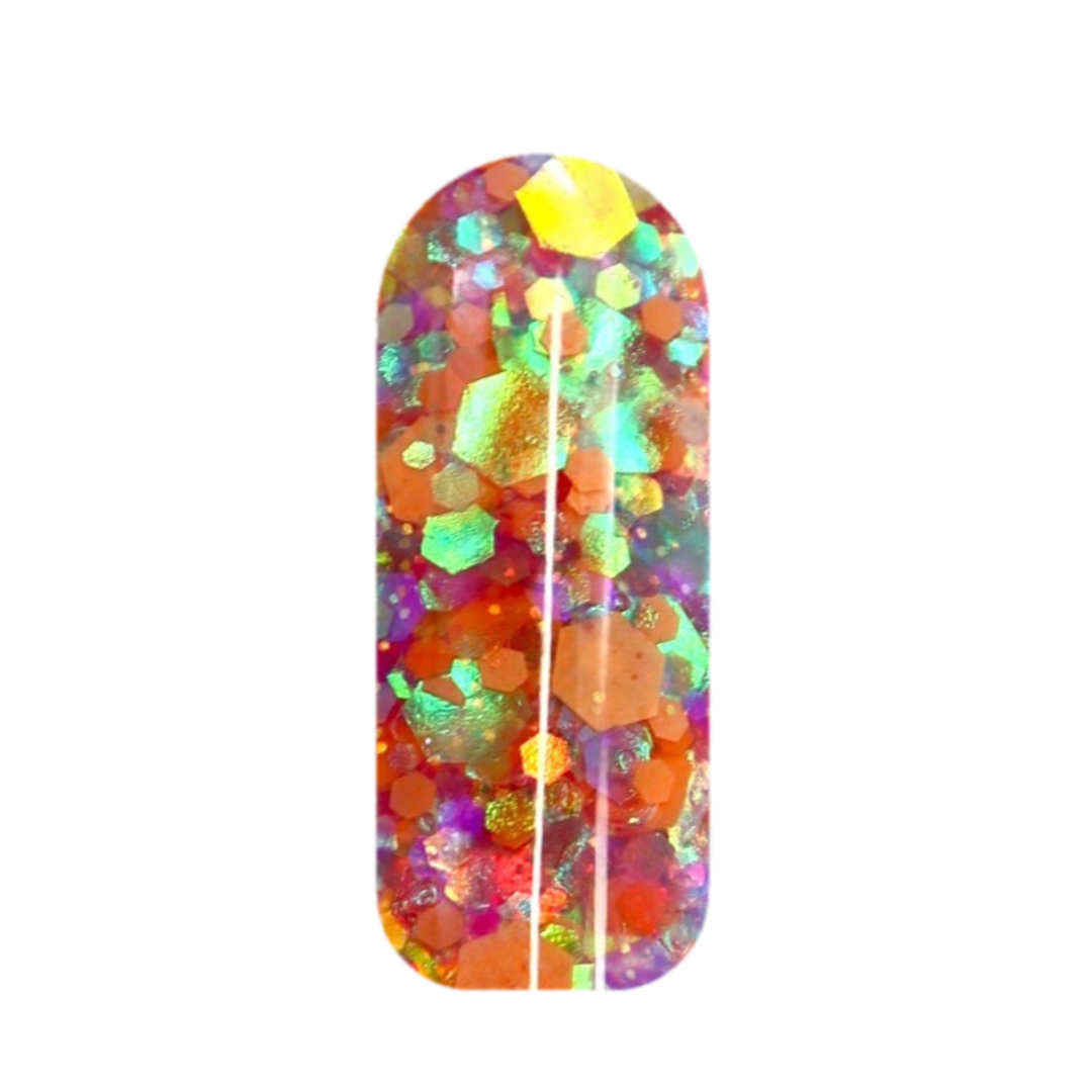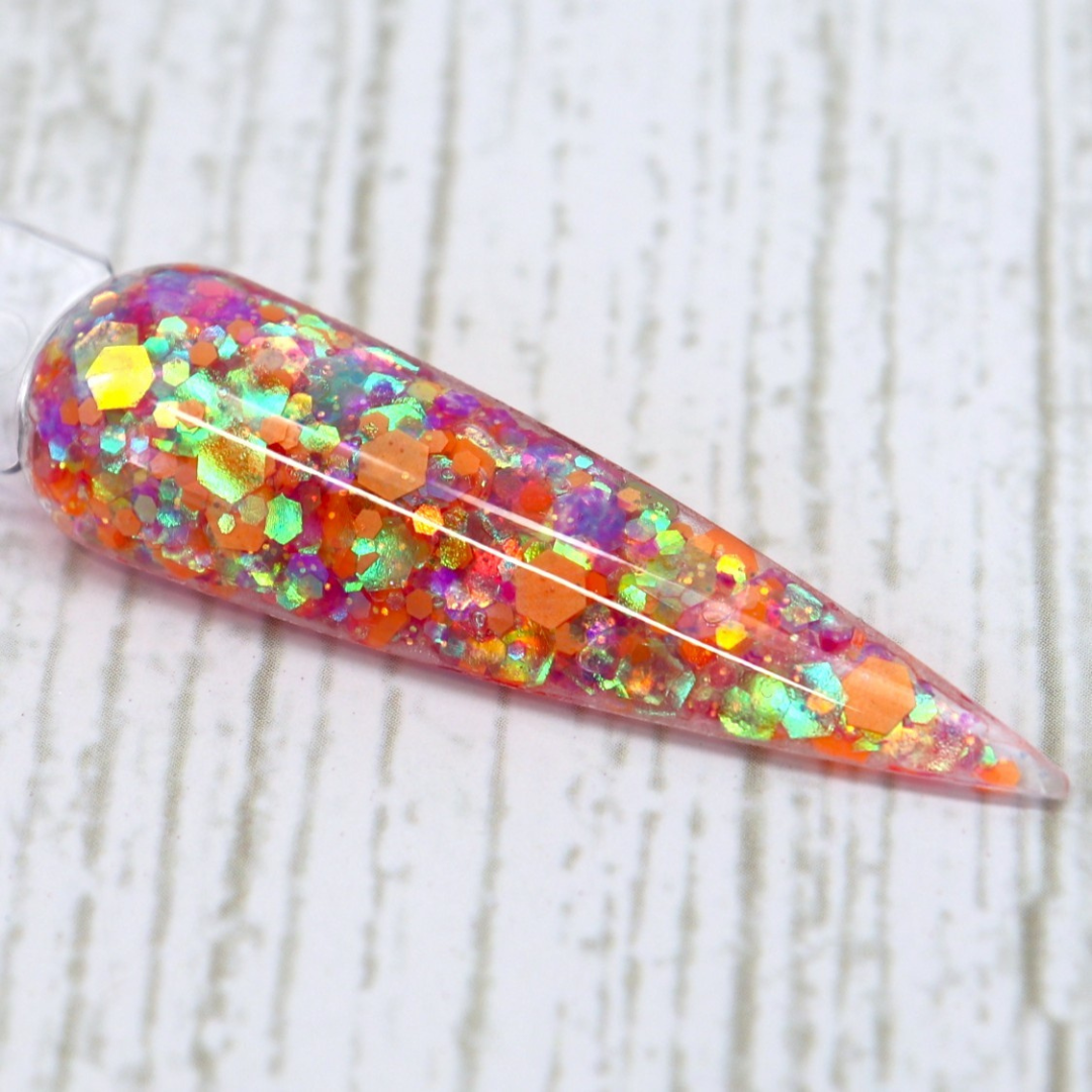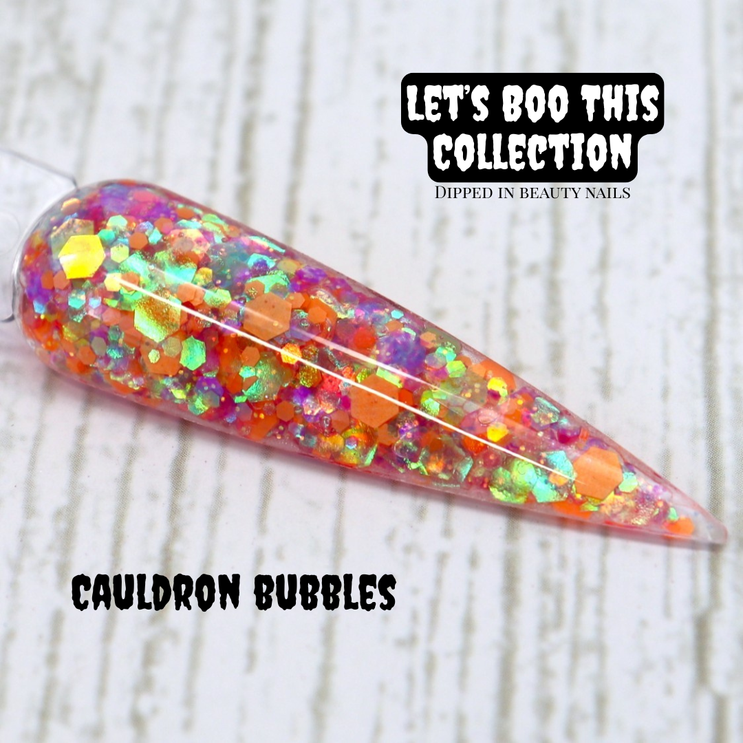 Stir up some magic with Cauldron Bubbles – a chunky glitter dip powder with playful pops of orange, green, and purple. A true potion of sparkle for your fingertips!