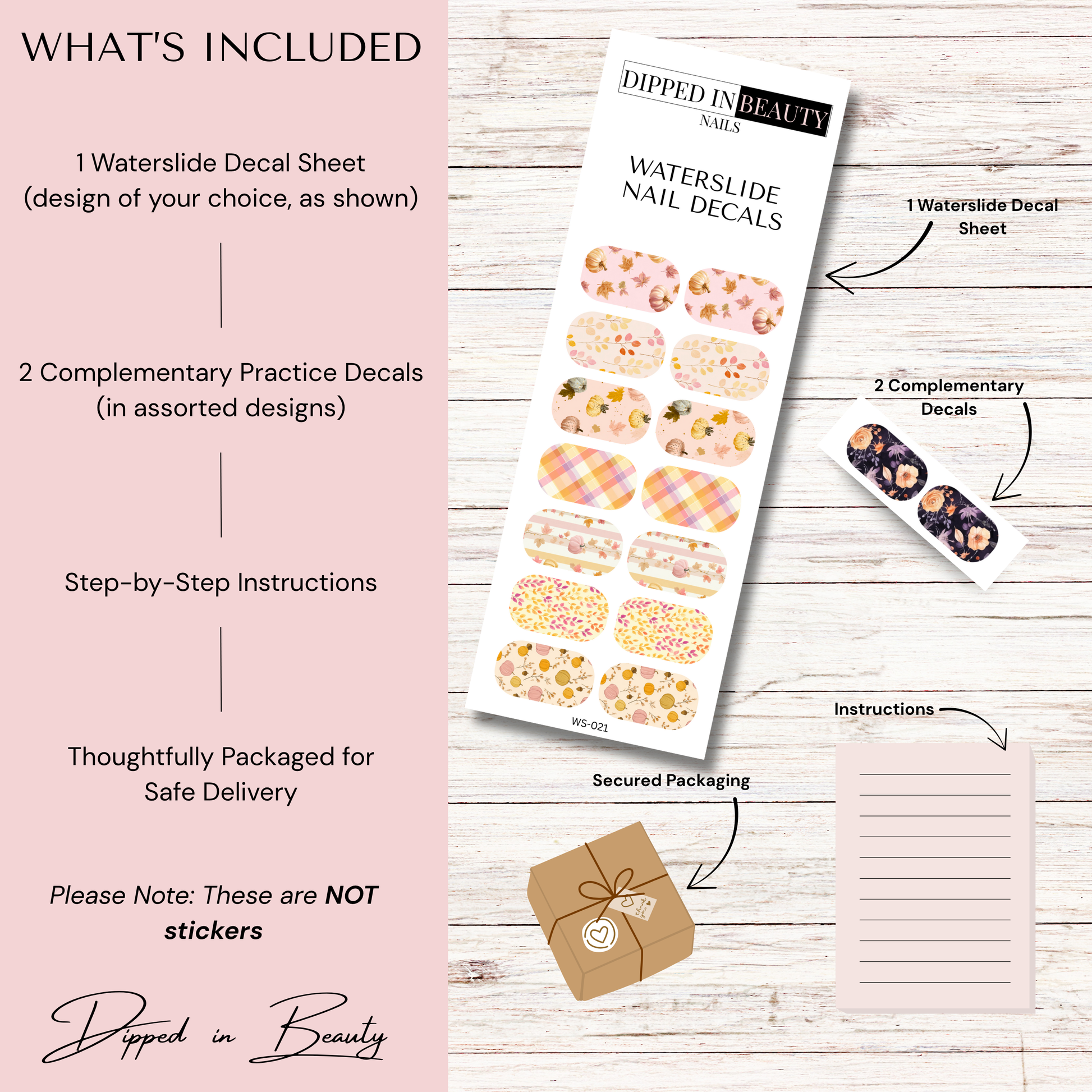 🍂 Cozy up your manicure with these Fall Waterslide Nail Decals! Featuring pumpkins, autumn leaves, warm plaids, and soft seasonal hues, these full nail wraps perfectly capture the beauty of fall. Easy to apply with dip powder, gel, or polish — ideal for creating warm, stylish autumn manis at home.