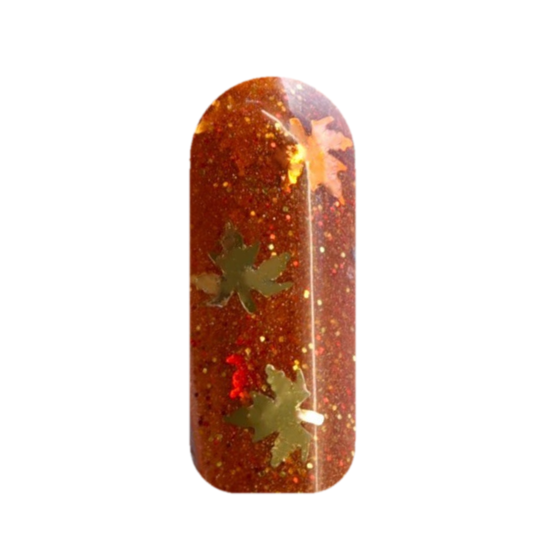 Celebrate the splendor of autumn with Falling Leaves – This dip powder features rich copper tones and color-shifting shimmer, beautifully complemented by a blend of orange and gold maple leaf chunky glitter. It captures the vibrant, crisp essence of fall and adds a touch of seasonal magic to your manicure.