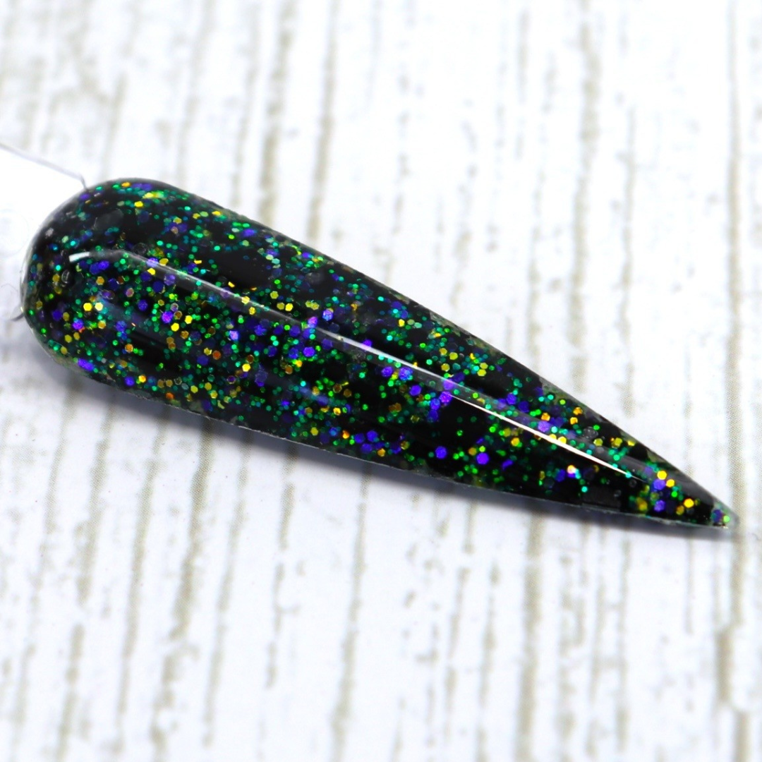 Bring your nails to life with Frankenfine – a black glitter dip powder with holographic sparkles that flash green, purple, and blue like a mad scientist’s creation.