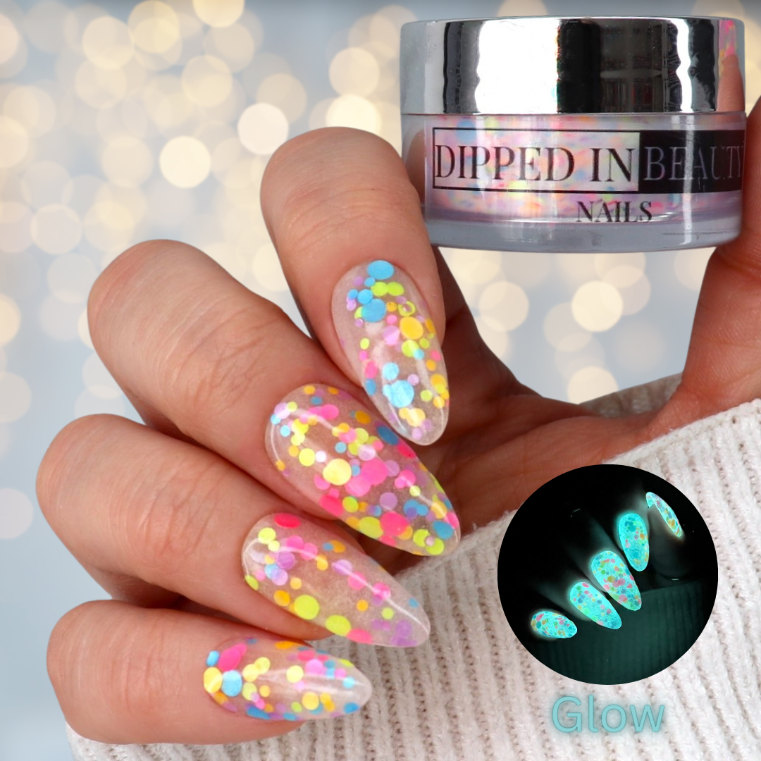 Shine brighter with Glow Getter – This dazzling dip powder topper is packed with a vibrant rainbow of glitter that glows in the dark, turning your manicure into a radiant spectacle. Perfect for adding a splash of color and a touch of magic to any look, Glow Getter ensures your nails stand out from the crowd – day or night!