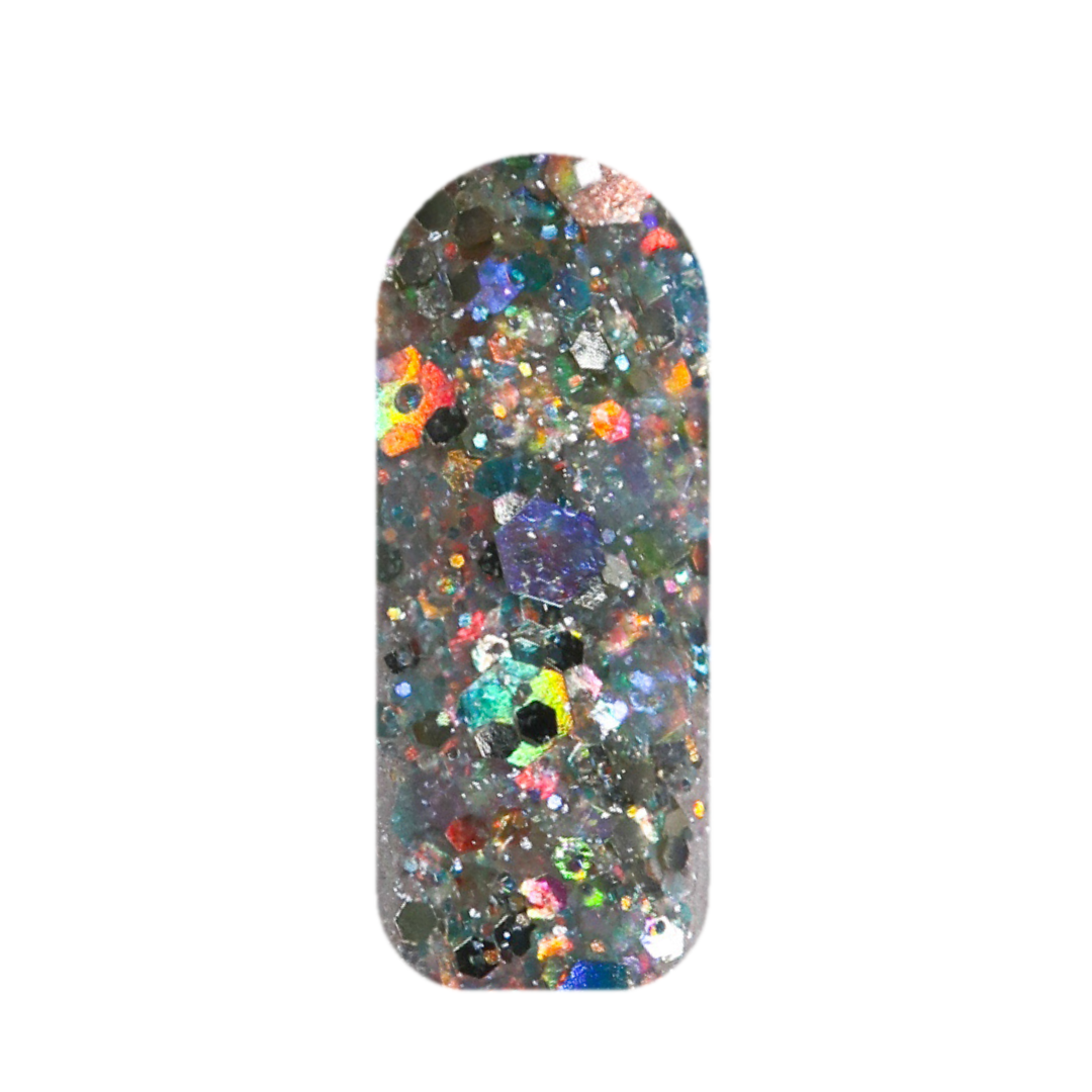 A clear dip powder packed with holographic and iridescent glitter, perfect for layering or wearing on its own.