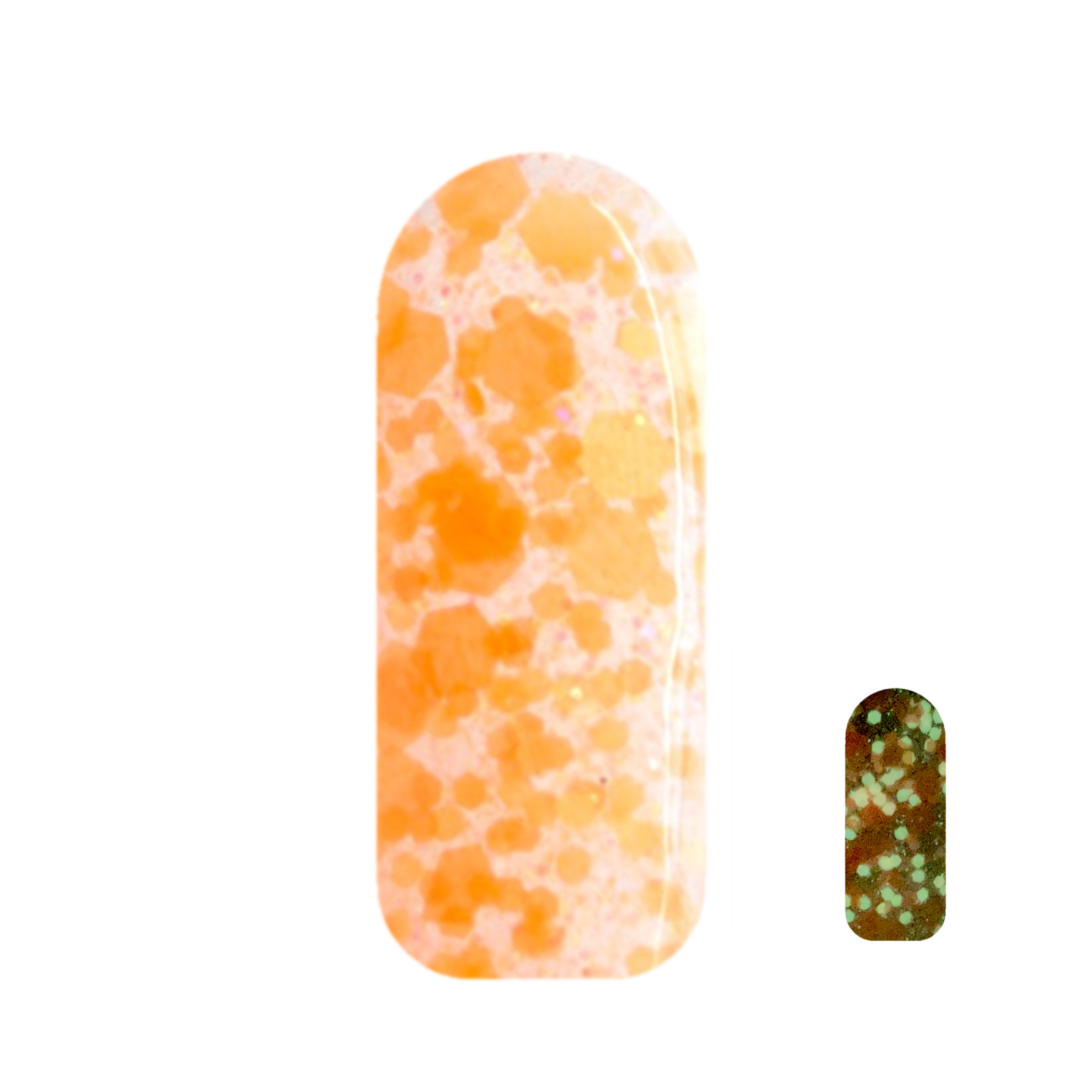 Get Your glow on with Pumpkin Parade – a chunky orange glitter dip powder that’s here to make your Halloween nails “boo-tiful” and “gourd-geous”! This vibrant shade not only sparkles but also glows in the dark, ensuring you’ll light up the night with festive flair.