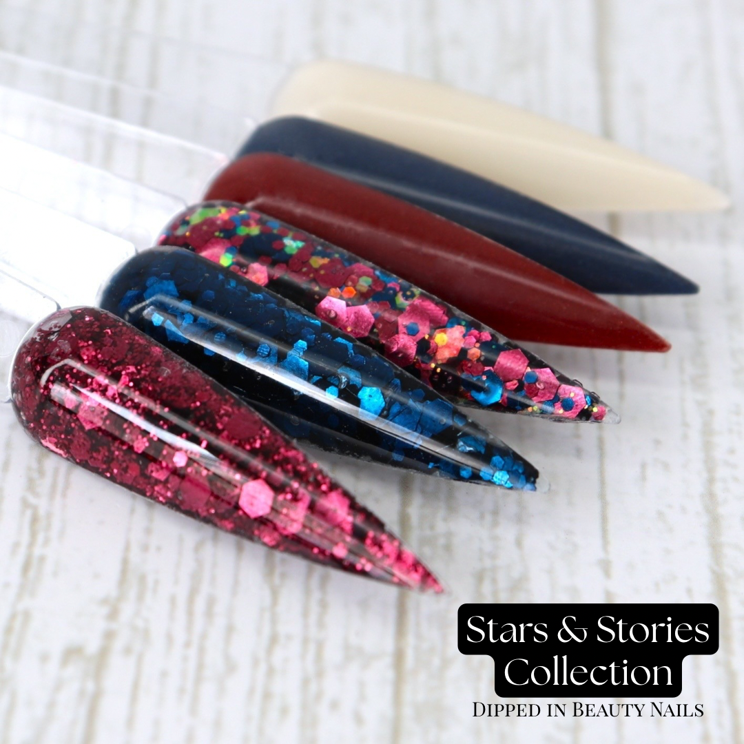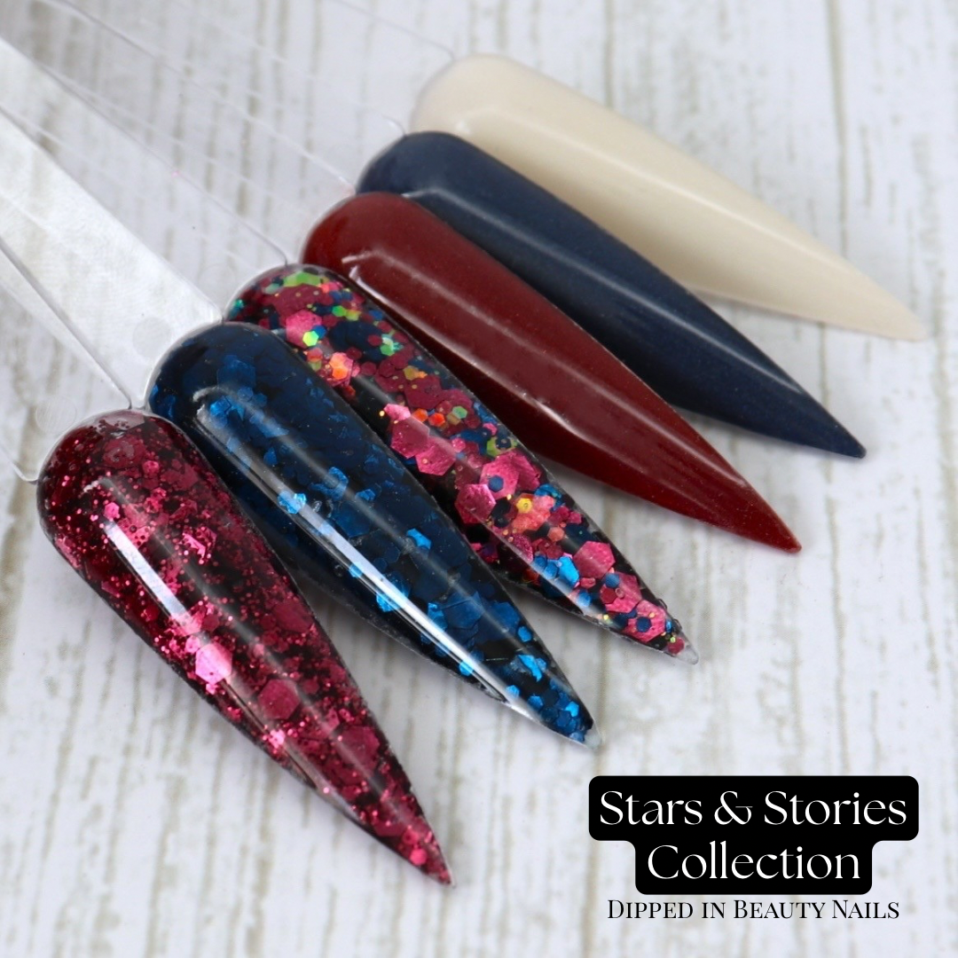 Step back into sweet memories and timeless moments with the Stars & Stories Collection, featuring six nostalgic dip powders inspired by the cozy charm of vintage Americana. This heartfelt collection captures the feeling of summer fairs, worn denim, front porch swings, and quiet country evenings. Each shade is designed to evoke warmth, familiarity, and the simple joy of days gone by.