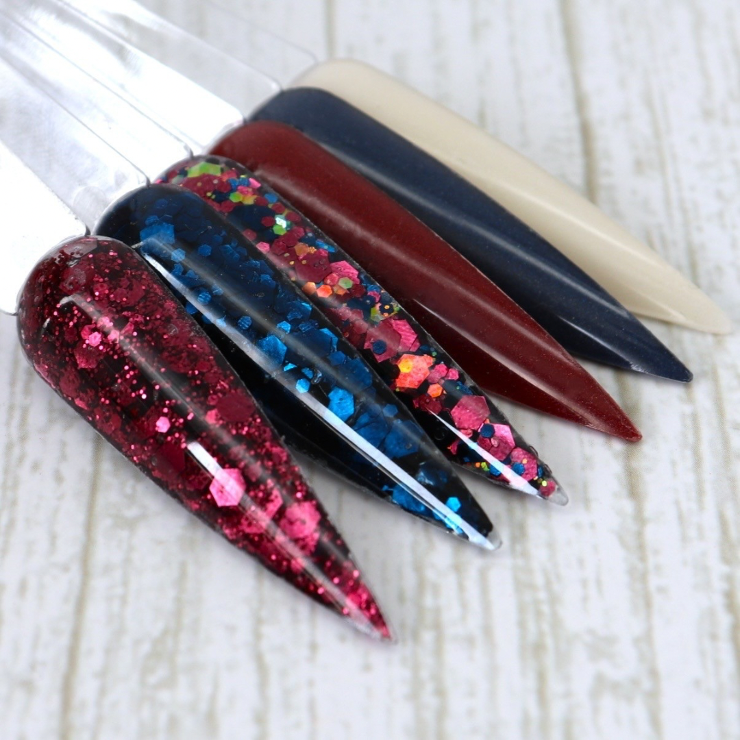 - Homestead: A deep burgundy dip powder filled with a mix of fine and chunky pink glitter, Homestead radiates warmth and comfort—like flipping through old photo albums or sipping cocoa by a crackling fire.