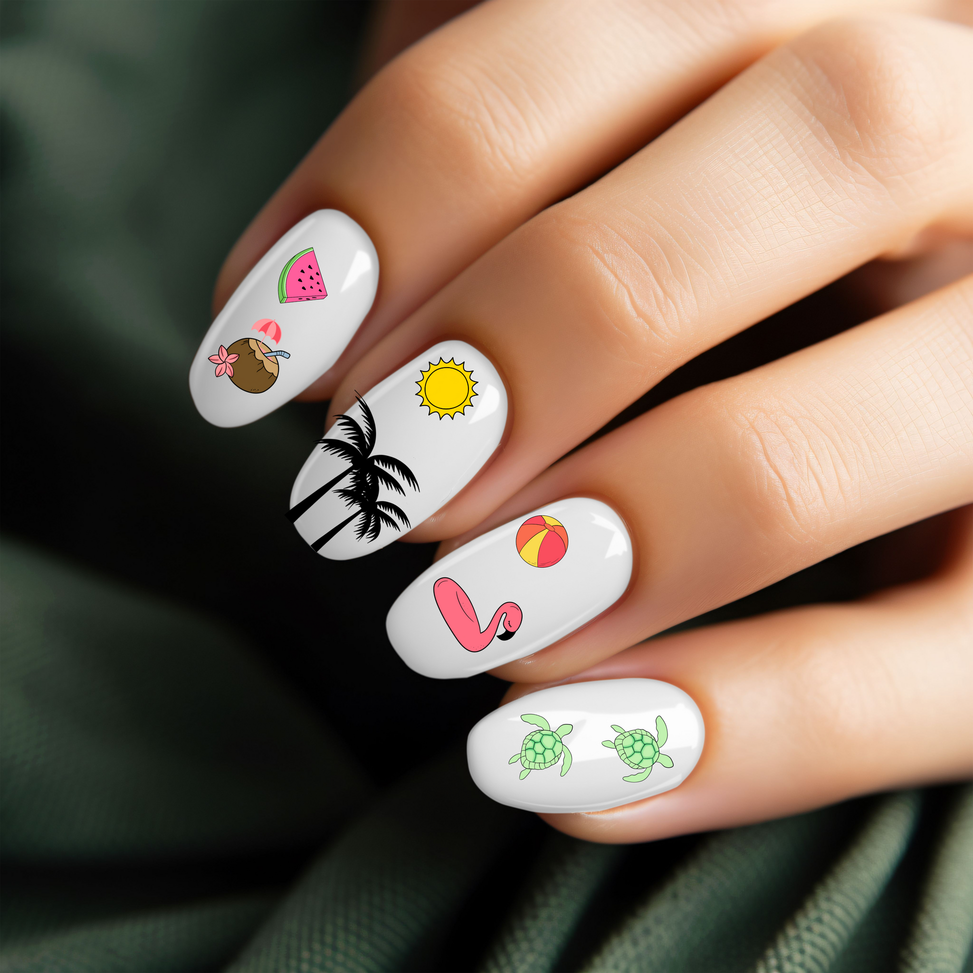 Each sheet includes a variety of tiny decals (sized between 0.3" and 0.6" / 0.76 cm to 1.52 cm) printed on clear glossy sticker paper — perfect for a seamless look when applied over white or very light-colored nails. These stickers are great for press-ons, acrylics, or natural nails.