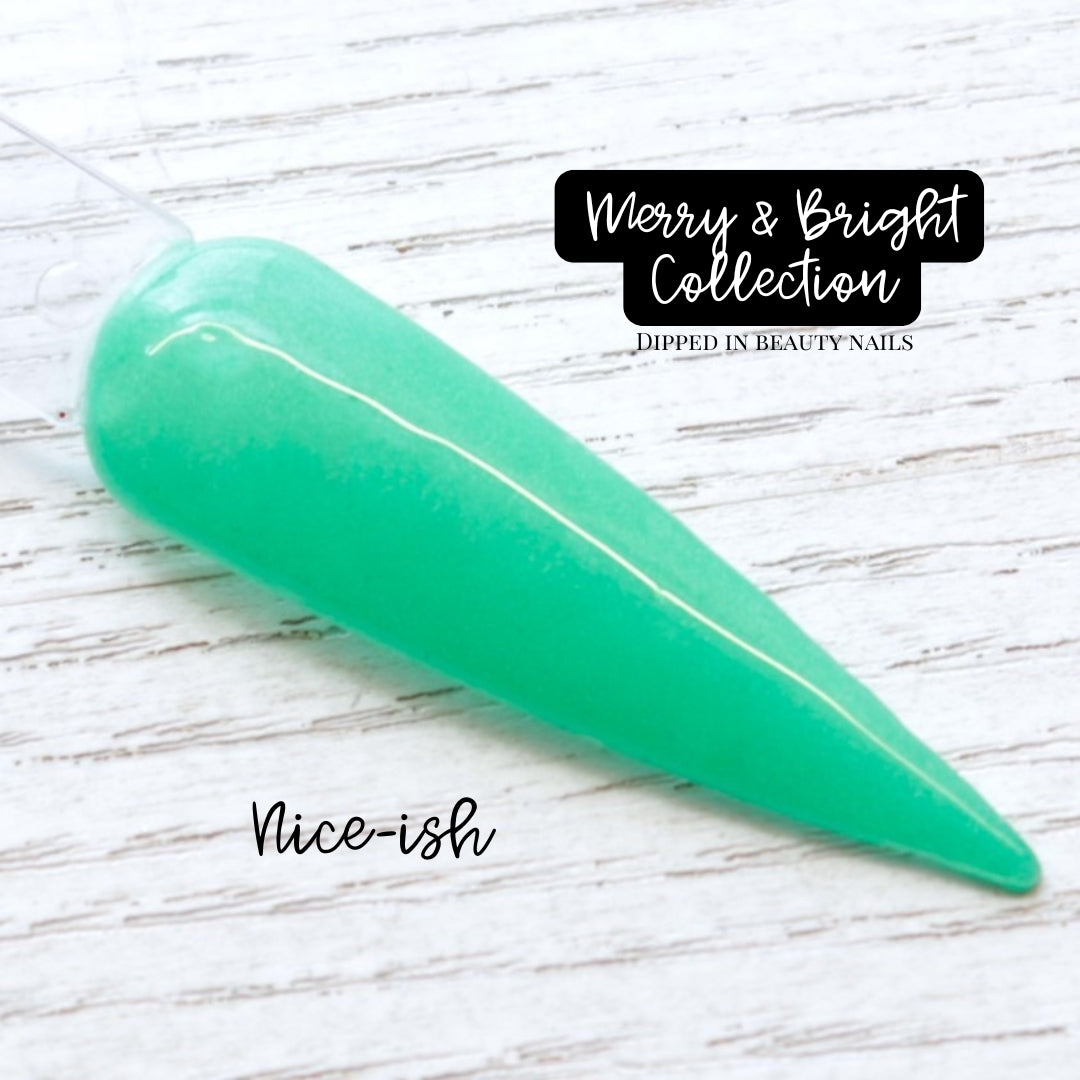 Celebrate the season with a touch of Nice-ish! This solid light green dip powder with a hint of shimmer is perfect for those who want to be a little naughty and a little nice. Whether you're feeling festive or just a touch cheeky, Nice-ish adds a subtle sparkle to your holiday nails, keeping you on the edge of the naughty list in style.