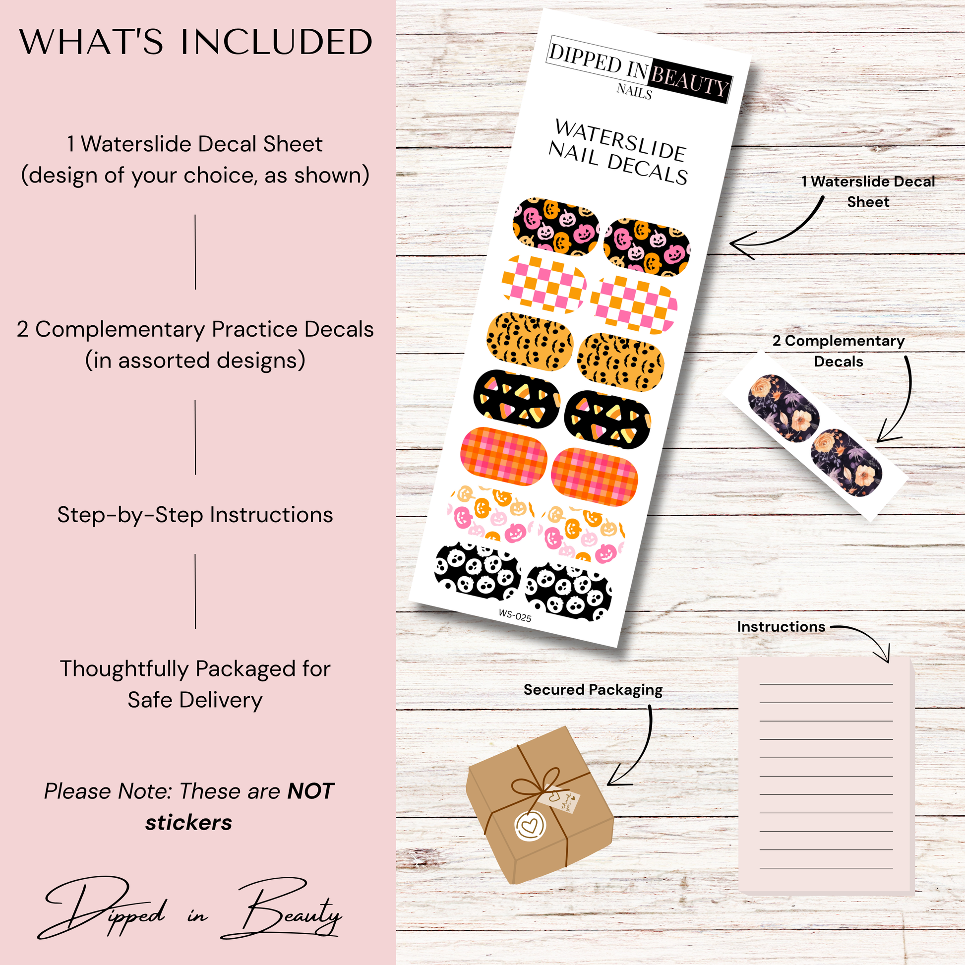 🍬 Make your Halloween mani pop with these Pumpkin, Candy Corn & Checkerboard Waterslide Nail Decals! Featuring playful jack-o’-lanterns, candy motifs, pink and orange plaids, and spooky skulls, these full nail wraps are perfect for creating fun, vibrant seasonal looks. Easy to apply with dip powder, gel, or polish — ideal for Halloween nail lovers.