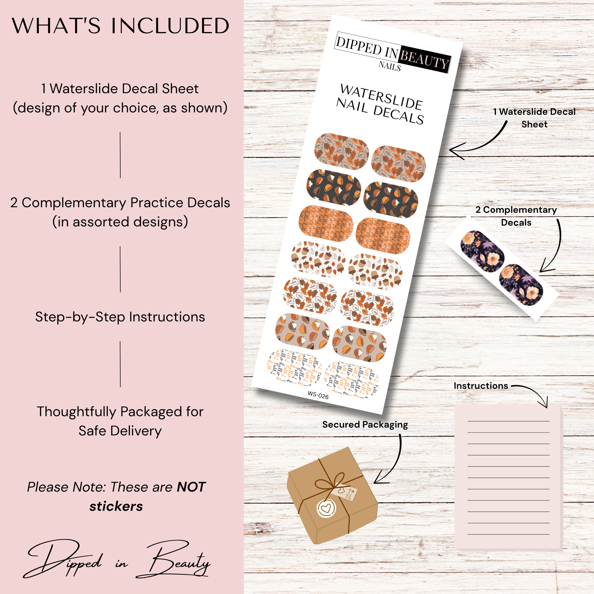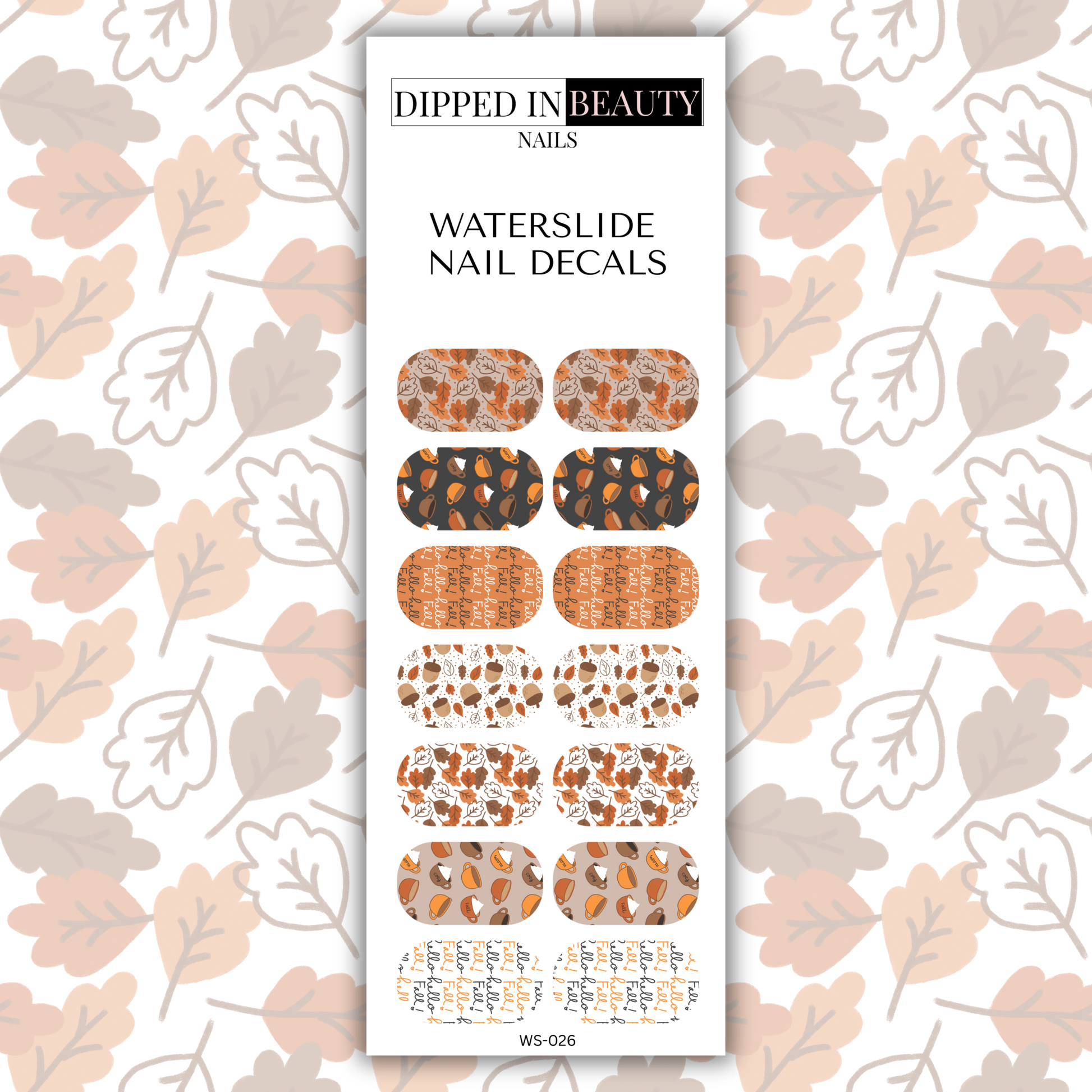 🍂 Celebrate the beauty of autumn with these Acorn, Leaf & Plaid Fall Waterslide Nail Decals! Featuring cozy plaids, scattered acorns, autumn leaves, and warm seasonal tones, these full nail wraps are perfect for creating elegant fall manis. Easy to apply with dip powder, gel, or polish — ideal for fall lovers and DIY nail enthusiasts.